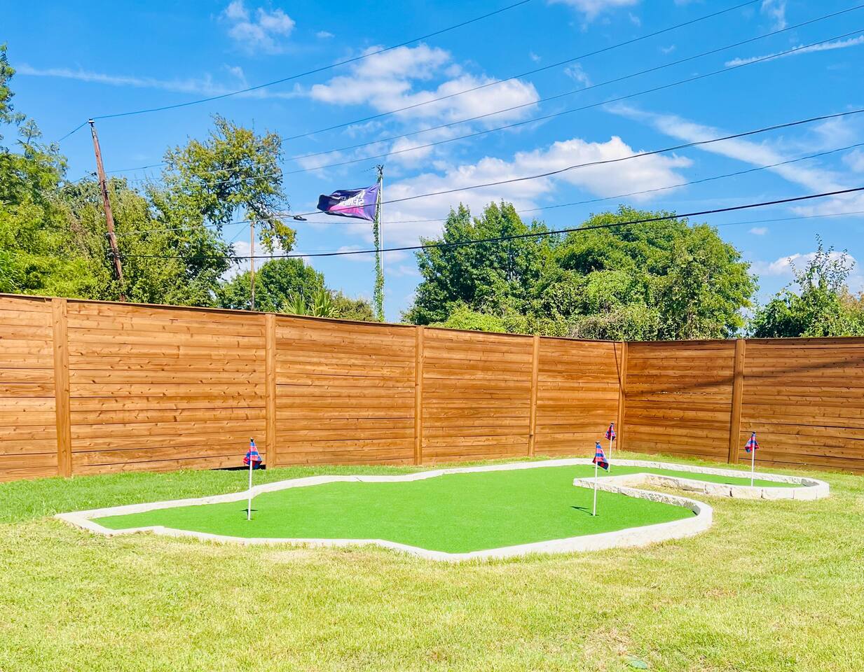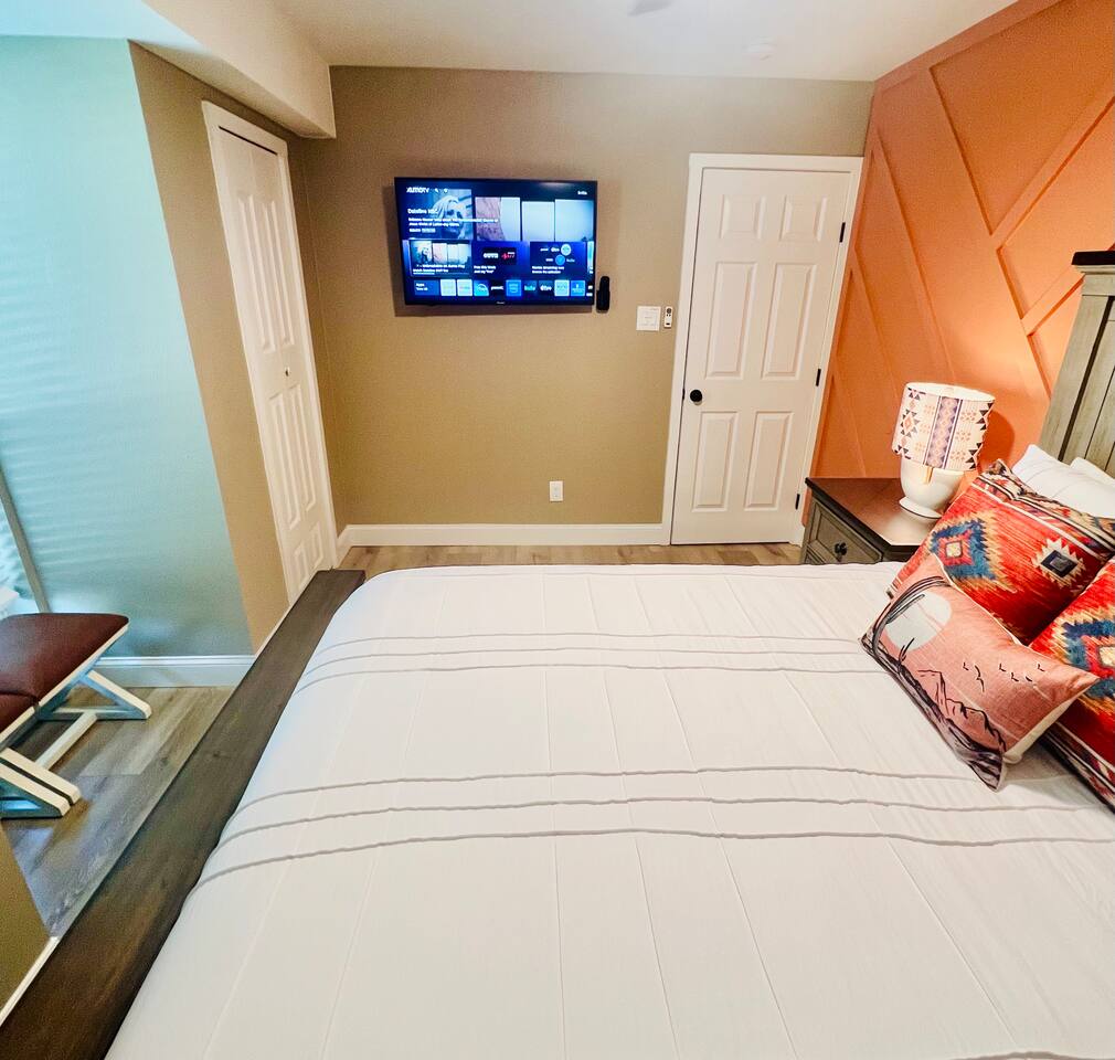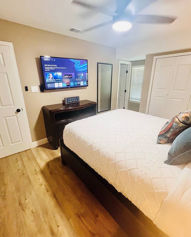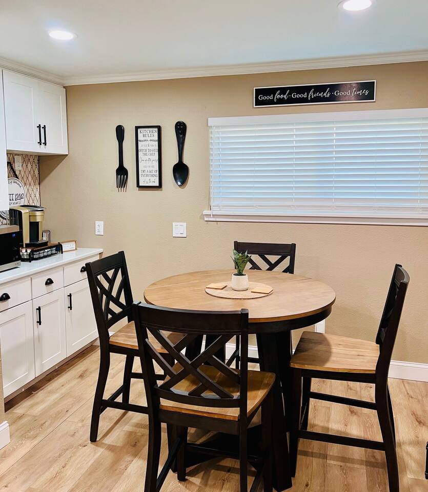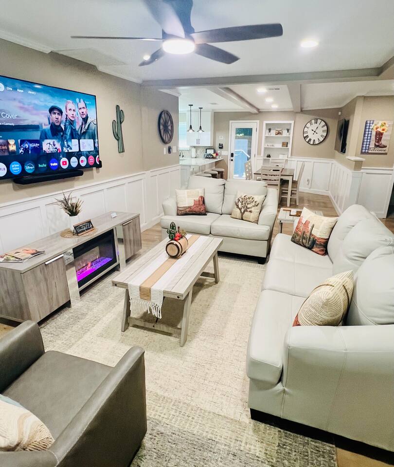 Here’s a quick overview of the layout: Bedrooms 1 and 2 share a full bathroom located in the hallway. Bedroom 3 has a private en-suite bathroom for added convenience. The sleeper sofa in the living room converts to a queen bed for up to 2 guests. While our guest limit is 6, the 3 bedrooms and the sleeper sofa offer flexible sleeping options, making our space ideal for families with children, couples, singles, or mixed groups. The living area is perfect for gathering, featuring a dining table for 6, a kitchen with breakfast bar and seating for casual dining, and a cozy coffee nook that seats 4, perfect for casual meals or morning coffee. Our outdoor space is designed for relaxation and fun! Enjoy the covered patio, where you’ll find a large TV, a dining table, and plenty of additional seating to unwind. Fire up the BBQ grill for a cookout, or gather around the firepit in the evening for a cozy atmosphere. For some extra entertainment, take advantage of the putting green—perfect for a little friendly competition or practicing your short game. If mini-golf isn’t your thing, there’s also cornhole to keep the good times going. Make yourself at home and enjoy the convenience of this prime location!