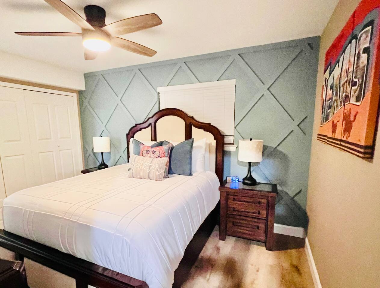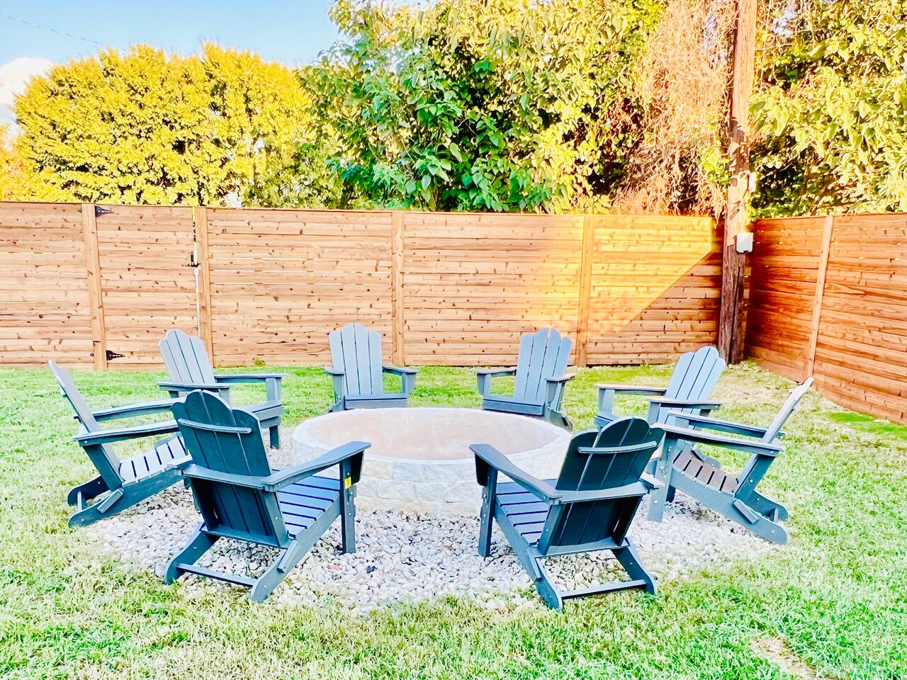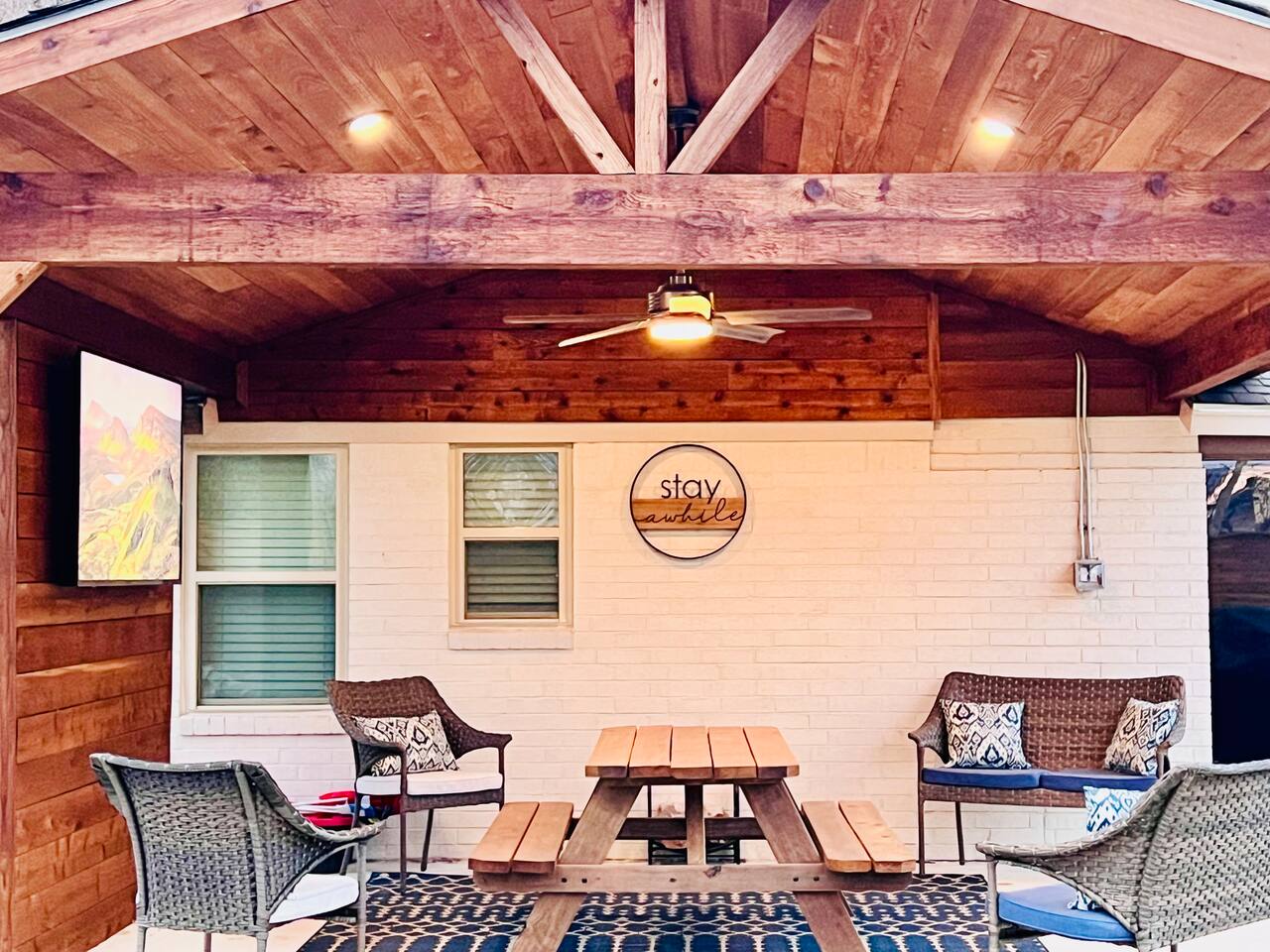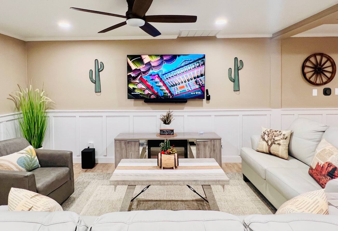 Here’s a quick overview of the layout: Bedrooms 1 and 2 share a full bathroom located in the hallway. Bedroom 3 has a private en-suite bathroom for added convenience. The sleeper sofa in the living room converts to a queen bed for up to 2 guests. While our guest limit is 6, the 3 bedrooms and the sleeper sofa offer flexible sleeping options, making our space ideal for families with children, couples, singles, or mixed groups. The living area is perfect for gathering, featuring a dining table for 6, a kitchen with breakfast bar and seating for casual dining, and a cozy coffee nook that seats 4, perfect for casual meals or morning coffee. Our outdoor space is designed for relaxation and fun! Enjoy the covered patio, where you’ll find a large TV, a dining table, and plenty of additional seating to unwind. Fire up the BBQ grill for a cookout, or gather around the firepit in the evening for a cozy atmosphere. For some extra entertainment, take advantage of the putting green—perfect for a little friendly competition or practicing your short game. If mini-golf isn’t your thing, there’s also cornhole to keep the good times going. Make yourself at home and enjoy the convenience of this prime location!